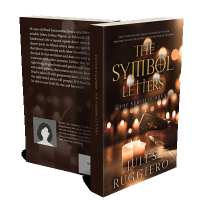 “A hand holding a book in front of lit candles with a mysterious ambiance. The title "THE SYMBOL LETTERS" is prominent.”