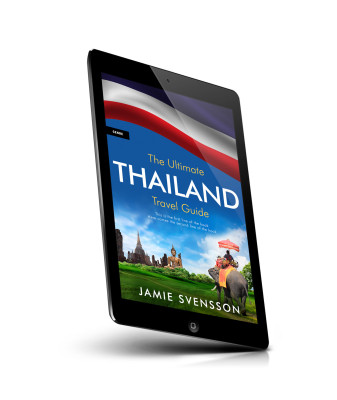 “A book cover featuring Thailand's flag, ancient ruins, a Buddha statue, and a person riding an elephant under a colorful parasol.”