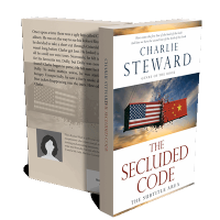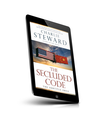 “Two shipping containers, one with a US flag and one with a Chinese flag, collide mid-air. Book title: "The Secluded Code."”