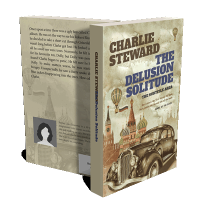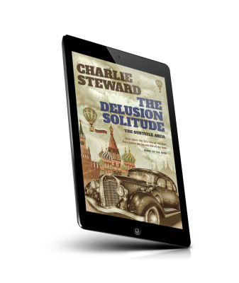 “Vintage-style book cover featuring a classic car and Russian architecture with a hot air balloon in the sky.”