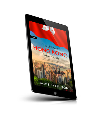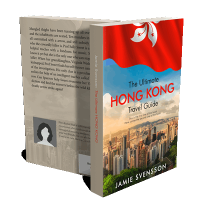 “A travel guide cover featuring Hong Kong's skyline and a flag with white stars and a flower on a red background.”