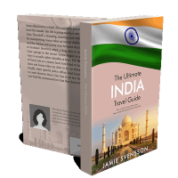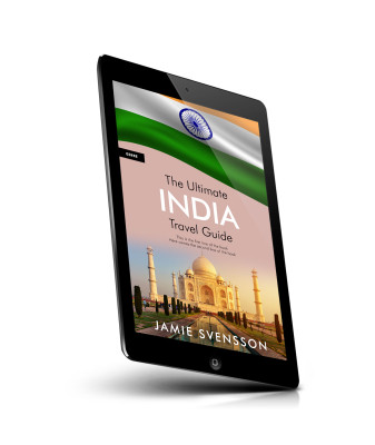 “A travel guide cover featuring the Indian flag and an image of the Taj Mahal in the background.”