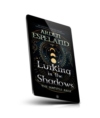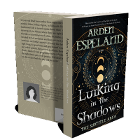 “A mystical book cover features crescent moons, stars, and intricate gold celestial designs.”