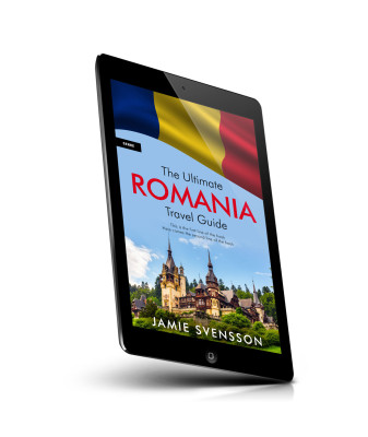 “A travel guidebook cover featuring Peles Castle in Romania with a waving Romanian flag at the top.”