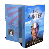 “A warrior in a helmet stands against a blue landscape with a large planet in the sky. The title "The Hunter" is prominent above.”
