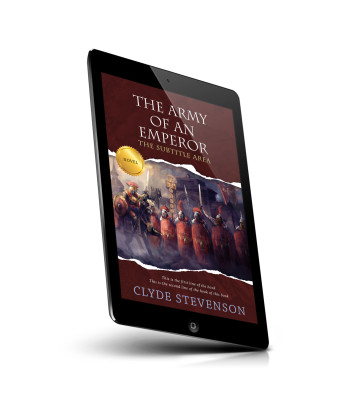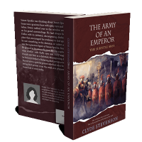 “Soldiers in Roman-style armor stand in formation with a castle in the background, under a torn paper effect displaying the title.”