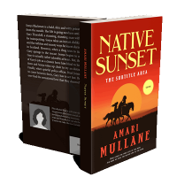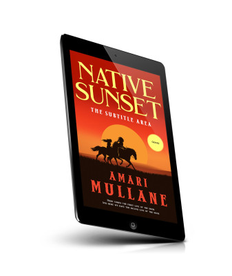 “Silhouettes of two riders on horseback against a vibrant sunset sky, with bold text above and below.”