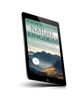 “Mountain landscape with a dynamic sky and a book cover design in the foreground.”