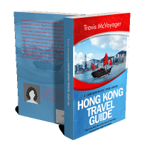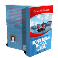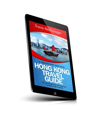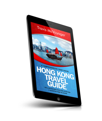“A traditional boat sails in front of Hong Kong's skyline, with a red and blue themed travel guide cover design.”