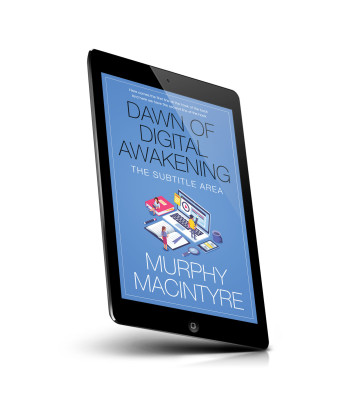 “A book cover with people interacting with a laptop, tablet, and documents on a blue background.”