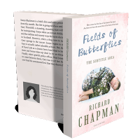 “A person lies curled up on grass with flowers, forming a dreamy, whimsical cover for a book titled "Fields of Butterflies."”