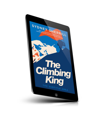 “Silhouette of a climber on a peak with a flag against a blue and orange background. Bold text title.”