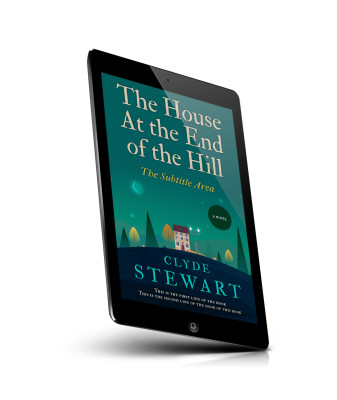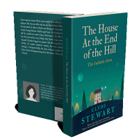 “A book cover featuring a house on a hill with trees and a starry night sky backdrop.”