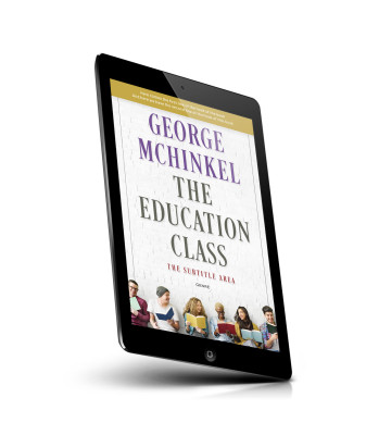 “Five people sit against a white brick wall, reading books and smiling. The image focuses on a book titled "The Education Class."”