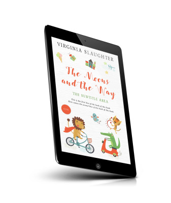 “Illustrated children's book cover with animals on bikes and playful elements like houses, stars, and a hot air balloon. Text fills the background.”