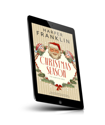 “A festive Christmas-themed book cover featuring Santa, two elves, holly, and red ribbon on a striped background.”