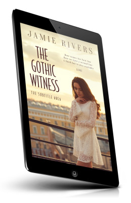 “Woman in a white lace dress stands pensively on a rooftop at sunset, with city buildings in the background.”