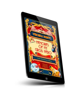 “Colorful circus-themed book cover with acrobats, vibrant patterns, stars, and ornate decorations.”