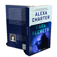 “A silhouette of a person holding a rifle against a mysterious, smoky blue background with the title "Dark Secrets."”
