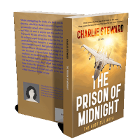 “A fighter jet flies against a bright, orange sky with large text overlay at the bottom.”