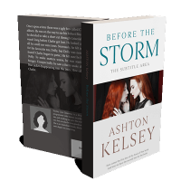 “Two redheaded women face each other closely, under the title "Before the Storm." The author's name "Ashton Kelsey" is at the bottom.”