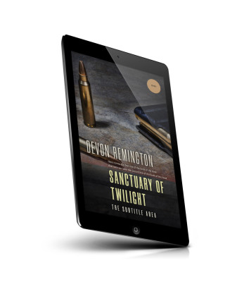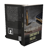 “A book cover featuring bullets and a magazine on a dark surface, with the title "Sanctuary of Twilight."”