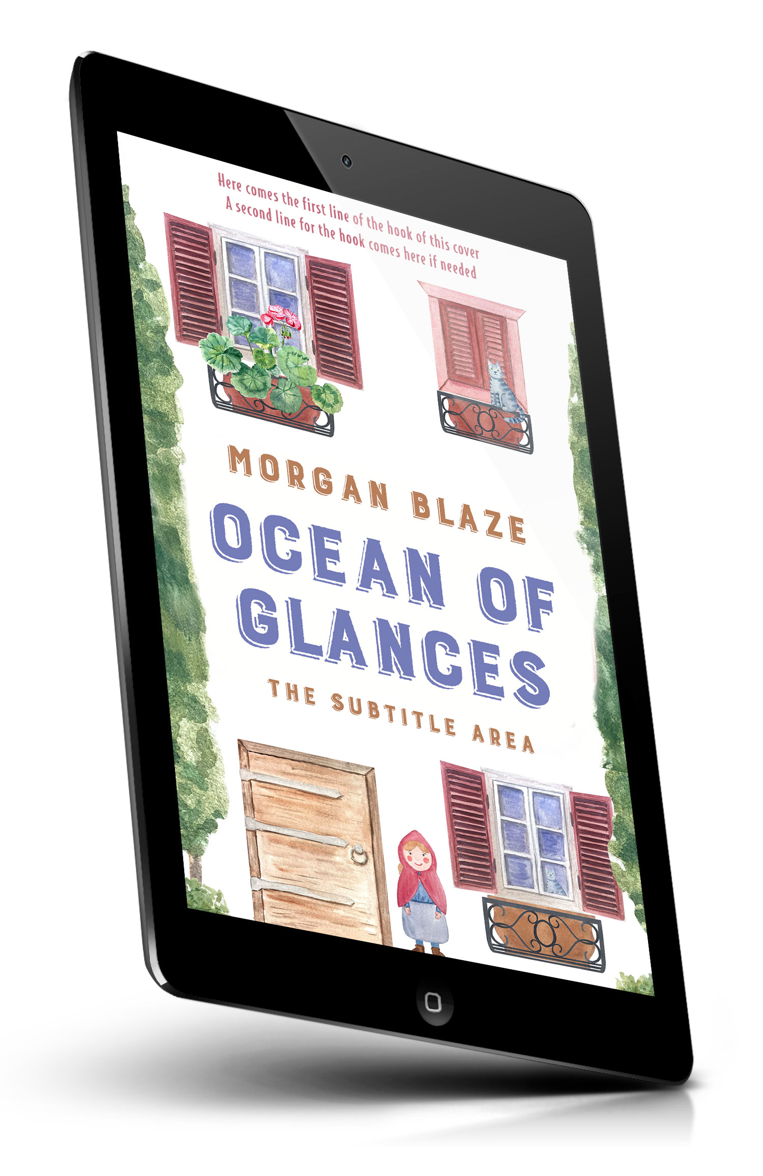 Tags: flower, window, cat, shutters, trees, illustration, artwork, book, cover, design, nature, greenery, pastel, girl, cloak, plants, balcony, wooden door, cozy, charming, premade cover, book cover design, self-publishing, ebook cover, print ready