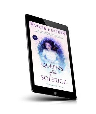 “A serene woman in a white dress lies in a wintry, mystical setting surrounded by ice and snow. Purple and blue tones dominate the cover.”