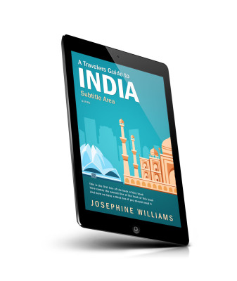 “A book cover titled "A Travelers Guide to India" with an illustration of landmarks like Lotus Temple and Taj Mahal in the background.”