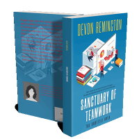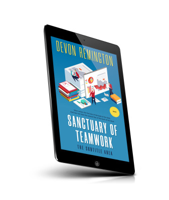 “Animated figures work around charts, graphs, and stacks of books on a large, open folder.”