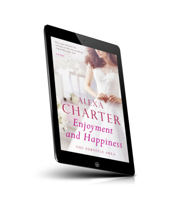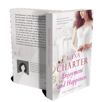 “A woman in a white lace dress stands gracefully, with text overlay promoting a book titled "Alexa Charter: Enjoyment and Happiness."”