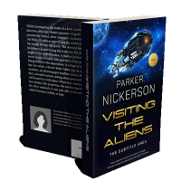 “A spaceship floats in a starry space background above futuristic gold text detailing a book by Parker Nickerson titled "Visiting the Aliens."”