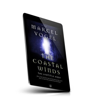 “A mystical book cover with a glowing light at the center, dark blue tones, and smoke or light effects around the door.”