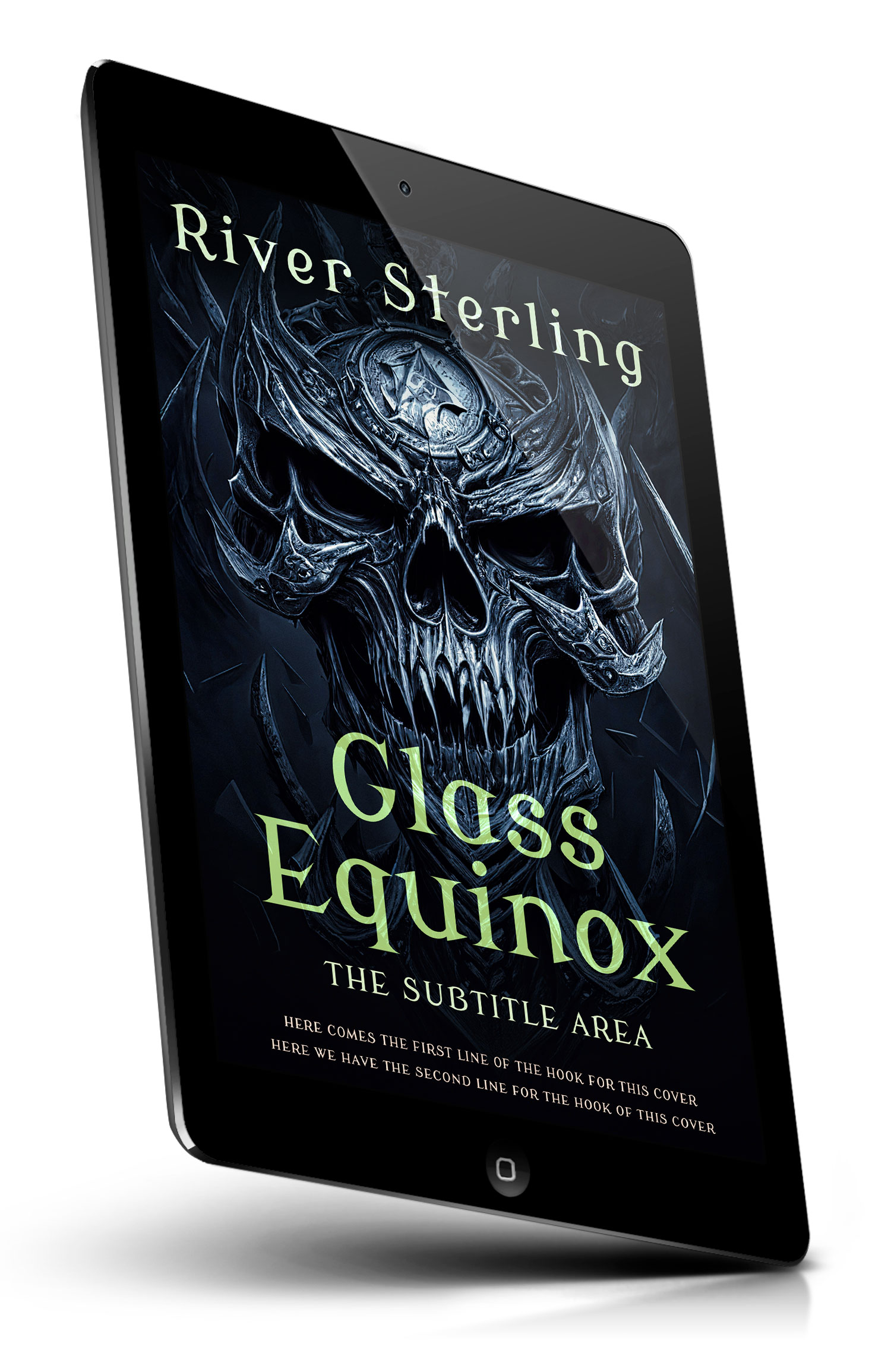 “Dark fantasy cover art showing a menacing, horned metallic skull with jagged teeth and a glowing gem, set against a shadowy background.”