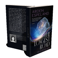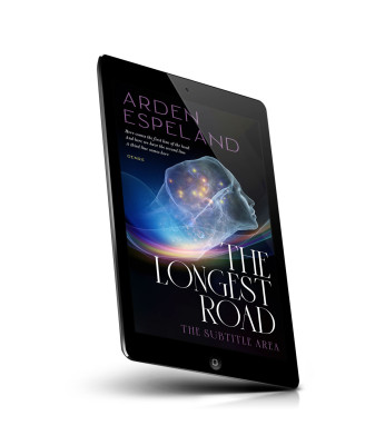 “A book cover showing a human head with light patterns, blue and purple abstract designs, and the title "The Longest Road" in large text.”