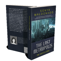 “Futuristic cityscape with spaceships in space, featuring a prominent author's name and book title design.”