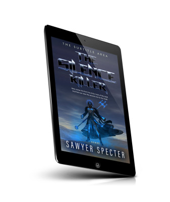 “A sci-fi book cover featuring a futuristic figure with a weapon, standing on a metallic surface with dark, moody lighting.”