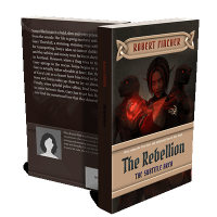 “A dark, mystical figure holding a glowing red orb stands between two stone statues on a book cover titled "The Rebellion."”