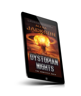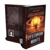“An intense explosion with a mushroom cloud dominates the background of a book cover titled "Dystopian Nights" by Alexa Jackson.”