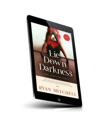 “A man in formal attire leans against a wall facing a woman in lingerie and high heels, with visible partial text indicating a book cover.”