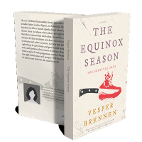 “A book cover featuring a knife with red markings. The title is "The Equinox Season" by Vesper Brennen.”