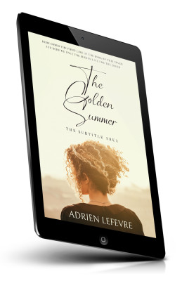 “A woman with curly hair looks at a hazy, sunlit landscape under a stylized title and author name.”