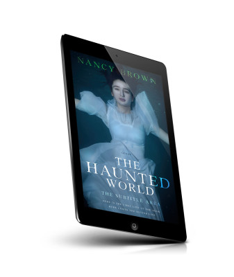 “A woman in a white dress is submerged underwater, appearing serene, with the title "The Haunted World" overlaid.”