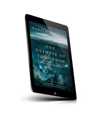 “A book cover with an ocean scene, featuring the title "One Glimpse of Tomorrow" and the author's name "Harper Weston."”