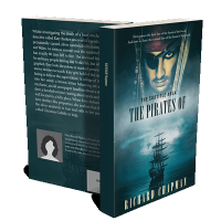 “A pirate-themed book cover featuring a ship at sea and a close-up of an eye-patch-wearing person.”