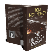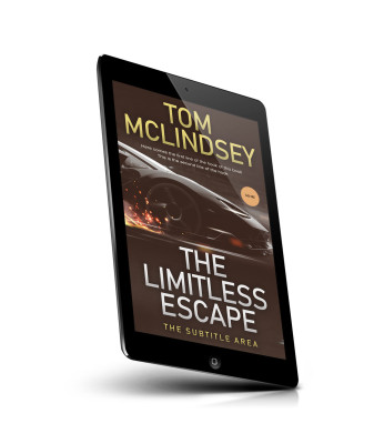 “A sleek car with sparks in motion, against a dark background. Title: "The Limitless Escape" by Tom McLindsey. Genre noted.”