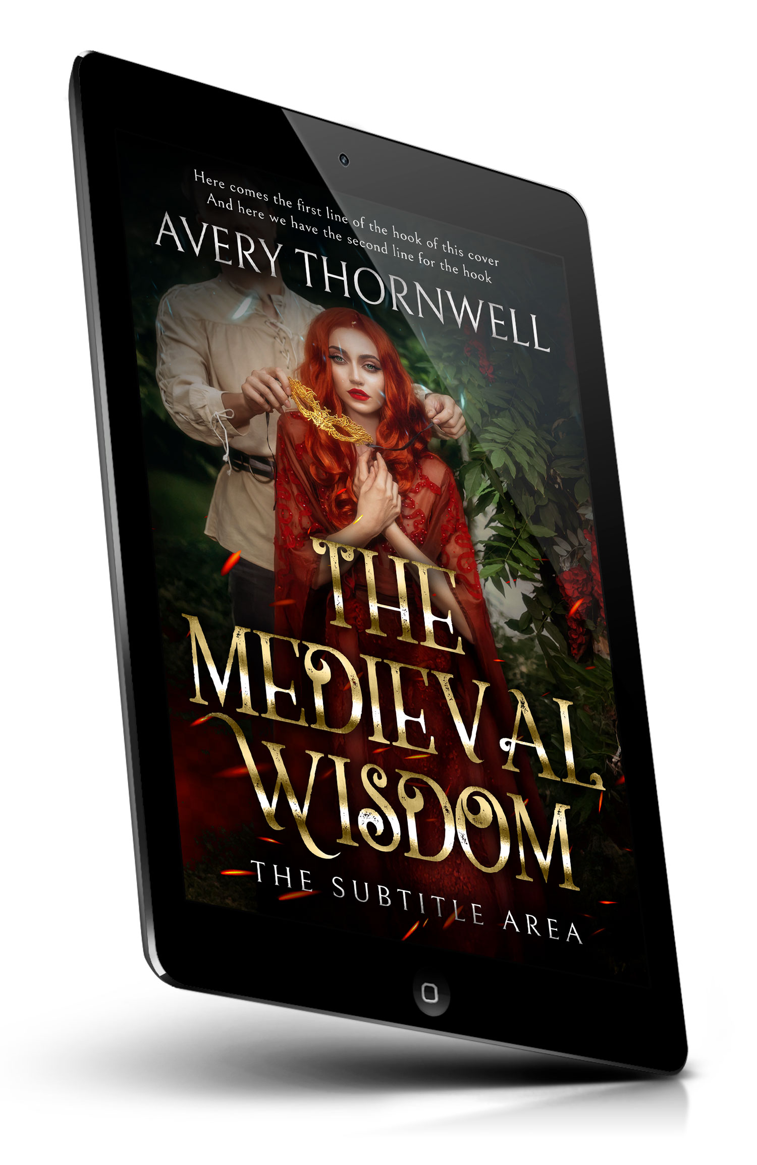 Tags: medieval, fantasy, romance, redhead, woman, couple, golden mask, masquerade, forest, ivy, roses, cloak, red dress, dramatic lighting, mystical, sparks, intrigue, historical, enchanted, gothic romance
