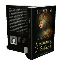 “A woman with intricate, glowing patterns around her head set against a dark background. The text features the title "Awakening of Galaxia".”
