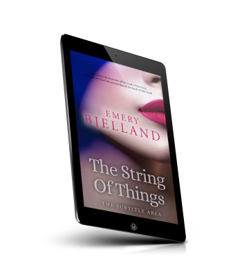 “Close-up of a woman's face with bold lipstick, featuring the book title "The String Of Things" and the author "Emery Bjelland".”