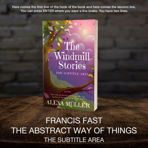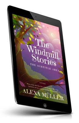 “An illustrated book cover featuring a whimsical tree at sunset with celestial accents, promoting "The Windmill Stories" by Alexa Müller.”